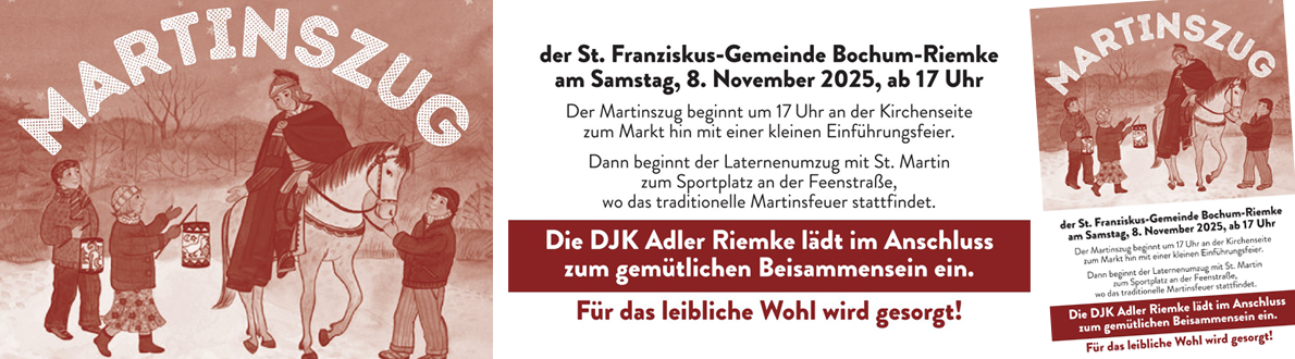 Am Samstag, 08.11.2025 findet wieder der traditionelle St. Martins Umzug durch die Riemker Gemeinde statt. Der Abschluss mit kalten und warmen und Getränken, Martinsfeuer und leckerem vom Grill findet wieder auf der Sportanlage an der Feenstraße statt